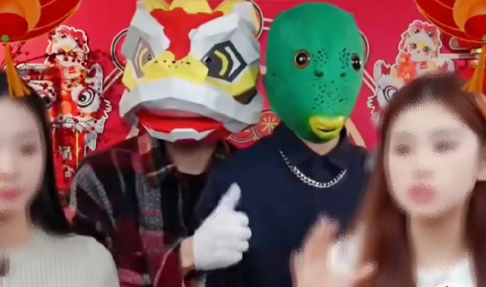 几天前,在三只羊旗下的抖音直播间里,突然出现了两个人,分别戴着绿色鲤鱼和红色狮子的头套。他们全程没有说话,只偶尔对着镜头比了几个手势。
