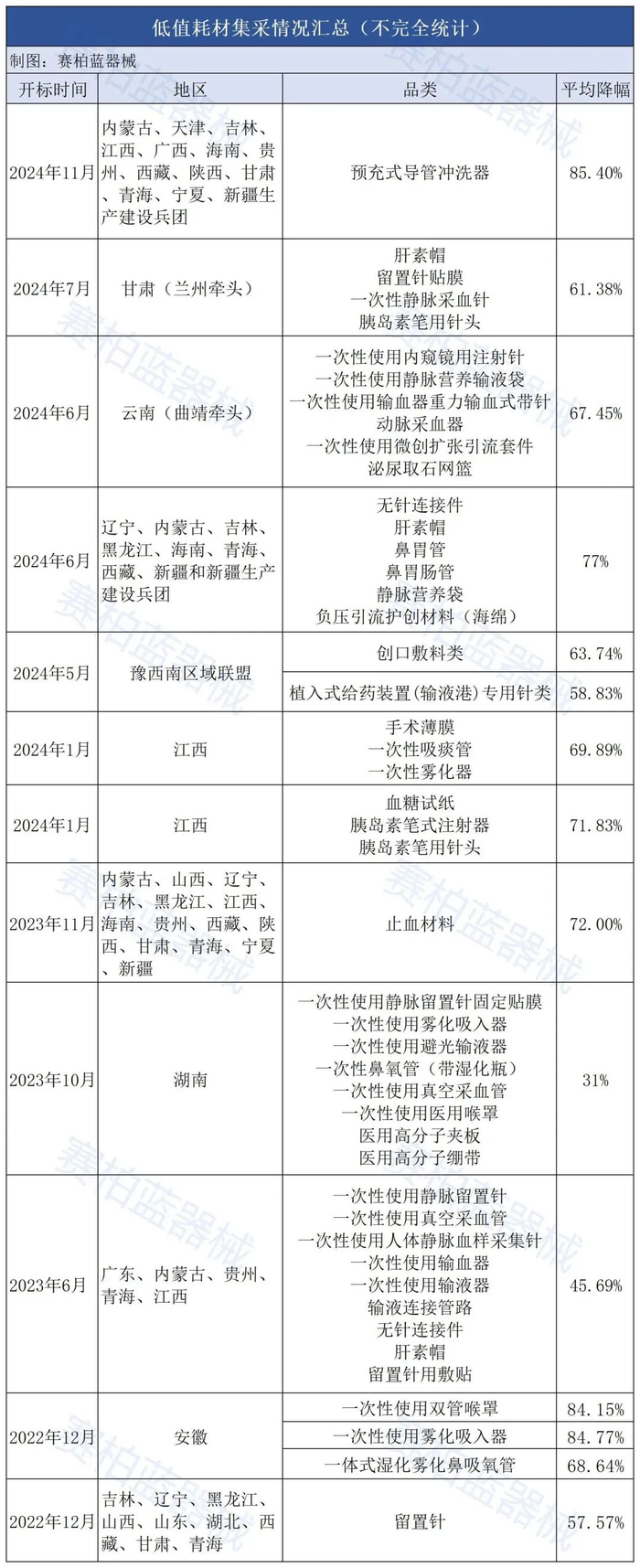 去年7月,甘肃完成了全省首次市际联盟普耗集采, 兰州牵头组织,肝素帽、留置针贴膜、一次性静脉采血针、胰岛素笔用针头4类低值耗材平均降幅61.38%。