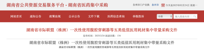 2月24日,湖南省公共资源交易平台发布《关于公布湖南省市际联盟(株洲)次性使用腹腔穿刺器等五类低值医用耗材集中带量采购文件的通知》,开展一次性使用腹腔穿刺器、压力传感器、一次性使用静脉留置针、一次性使用腰硬联合麻醉穿刺包、医用胶片集中带量采购工作。
