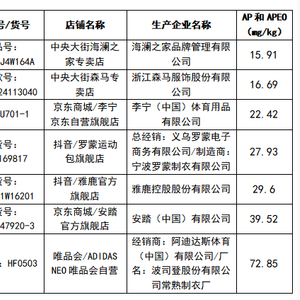 在烷基酚(AP)和烷基酚聚氧乙烯醚(APnEO)的测试中,除FILA、adidas neo、安踏、李宁、匹克5款样品明示标准为企标或为GB/T 14272-2011检验结果未做判定;其余20款样品均符合相关标准要求,其中有7款样品壬基酚(NP)+辛基酚(OP)+壬基酚聚氧乙烯醚(NPnEO)+辛基酚聚氧乙烯醚(OPnEO)结果显示检出量。