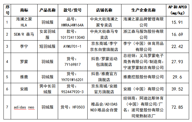 除FILA、JNBY、adidas neo、安踏、李宁、匹克6款样品明示标准为企标或为GB/T 14272-2011检验结果未做判定。