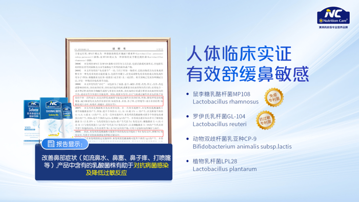 在此背景下,NC围绕消费者需求,重磅打造NC舒鼻益生菌系列产品。该产品凭借两大独创性优势,开创了以益生菌应对过敏性鼻炎的新纪元。
