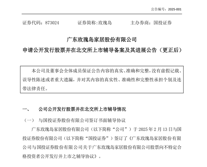 2月18日,玫瑰岛在全国中小企业股份转让系统指定信息披露平台披露《申请公开发行股票并在北交所上市辅导备案及其进展公告》,随后又于2月20日发布更正声明及更正后的公告。
