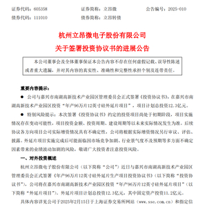 2月22日,杭州立昂微电子股份有限公司(证券简称:立昂微)发布关于签署投资协议书的进展公告,立昂微近日与嘉兴市南湖高新技术产业园区管理委员会正式签署《年产96万片12英寸硅外延片生产项目投资协议书》(以下简称“投资协议书”),将在嘉兴市南湖高新技术产业园区投资“年产96万片12英寸硅外延片项目”(简称“外延片项目”)。外延片项目计划总投资12.3亿元,其中固定资产投资11.2亿元。
