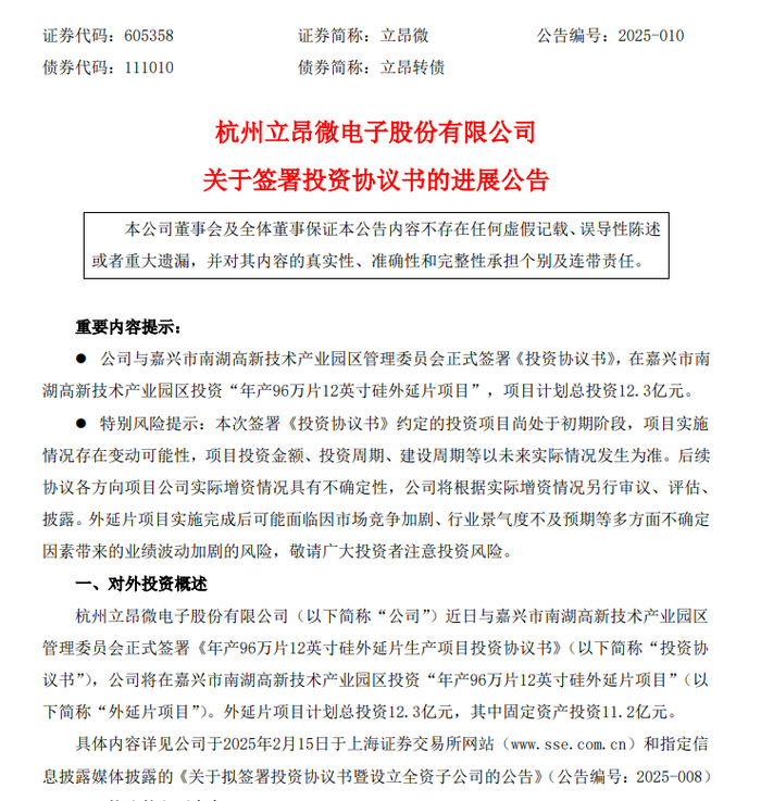 公告显示,立昂微在嘉兴南湖高新技术产业园区管理委员会辖区内投资外延片生产项目,与市、区及嘉兴南湖高新技术产业园区管理委员会合资注册成立新公司,注册资金 5 亿元。先期由立昂微成立全资子公司,注册资金 1 亿元,剩余注册资金各方后续陆续增资到位。该项目计划总投资 12.3 亿元,其中固定资产投资 11.2 亿元。预计项目全部建成达产后形成年产 96 万片 12 英寸硅外延片的生产能力。该项目在金瑞泓微电子(嘉 兴)有限公司厂房内实施。