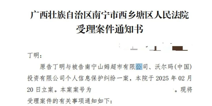 他提供的立案通知书显示,2月20日,原告丁明与被告南宁山姆超市有限公司、沃尔玛(中国) 投资有限公司个人信息保护纠纷一案已在广西壮族自治区南宁市西乡塘区人民法院立案。