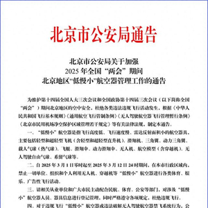 北京市公安局发布《关于加强2025年全国“两会”期间北京地区“低慢小”航空器管理工作的通告》