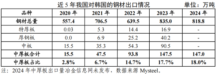 近五年,我国对韩国的钢材出口呈波动增长态势,其中中厚板占比呈稳定增长态势。2024年,我国对韩国的钢材出口总量818.75万吨,同比下降1.9%,较2020年增长46.9%;其中,对韩中厚板出口量147万吨,同比基本持平,但比2020年增长846.6%;占出口韩国钢材总量的18%,占我国中厚板出口量的14.1%。