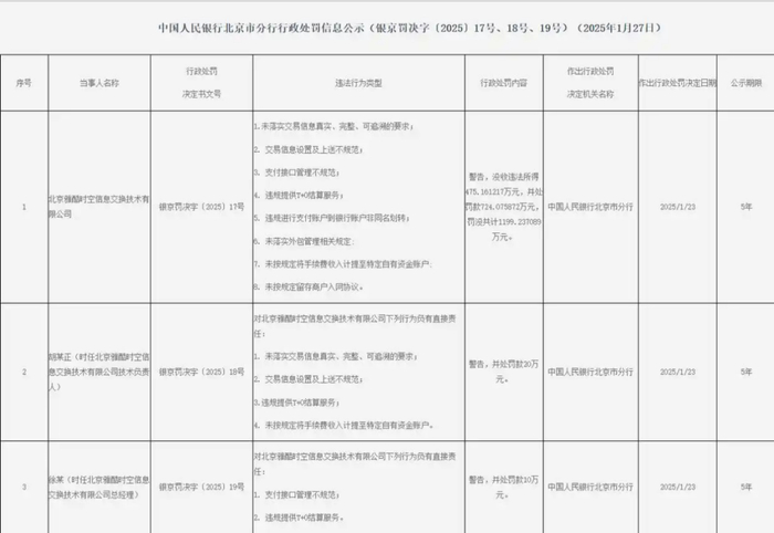 其中,北京雅酷时空信息交换技术有限公司因8项违法行为,被合计罚没1199.24万元,是年内人民银行针对支付体系开出的最大罚单。