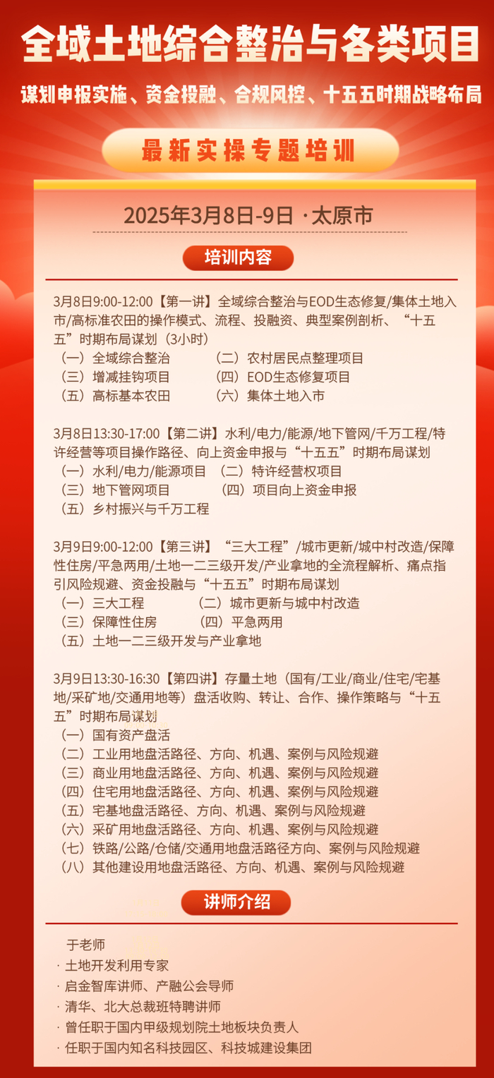 在此背景下,投实金课& 启金智库· 产融公会 将于 2025年3月8-9日(周六/日)在 太原市 举办《全土地整治、水利、能源、地下管网等项目谋划与资金申报及"三大工程"资金投融全流程解析专题培训》,将在两天12+小时时间里由实战派主讲嘉宾分享最新政策解析、项目谋划实施策略、向上申请资金要点、投融资盈利模式、政企合作机制、成功失败案例分析,洞悉业务运作中的各类细节和捕捉趋势把握机遇,助您建立展业必备的知识体系、实战技能、稀缺经验和有效人脉,诚邀您的参加!