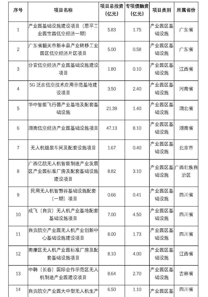 广东省(4个项目):形成恩平、韶关等工业园低空经济片区,总投资16.15亿元,专项债融资4.03亿元。