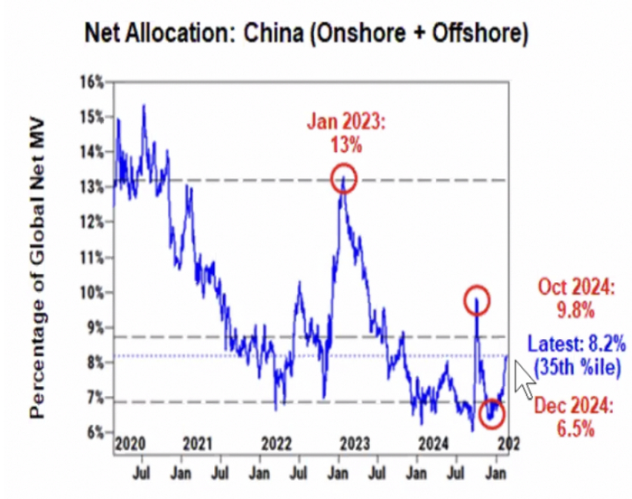 此外,投行人士也对记者提及,本轮港股上涨主要有南向资金驱动(连续48周净流入,2025年2月13日至19日净流入达65亿美元),亦有一些国际对冲基金抢筹,但资金净流入的程度仍不及去年9月底政策刺激官宣后的水平。高盛提及,中国股票当时在全球投资组合的占比从6%修复到10%附近,但如今仍在8.2%左右,长线外资仍未实质性采取行动。因此,上述因素以及中美关系的变化,仍将共同决定中国互联网巨头的估值修复进程。