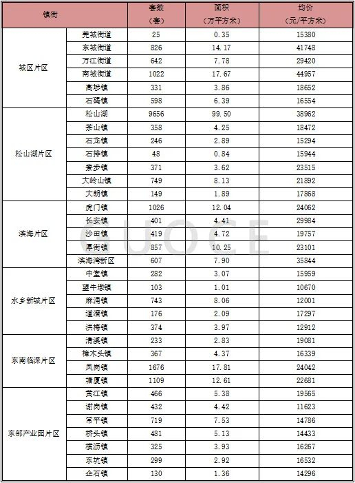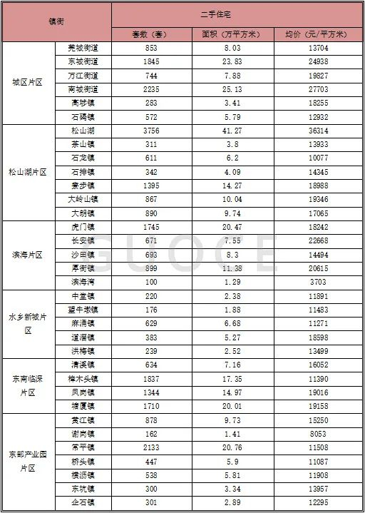 片区成交套数以城区以893套,9.98㎡居首位,水乡片区二手房成交量最少;镇街南城街道成交面积最多,松山湖成交价最高。