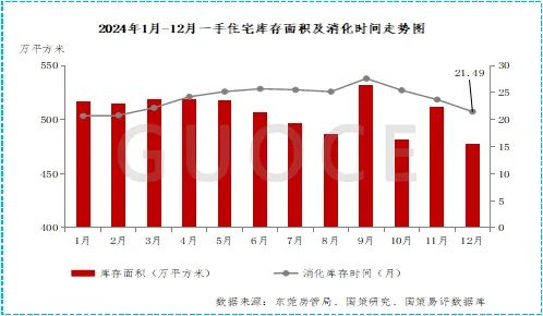 2024年东莞住宅供应量(248.38万平方米)略低于需求量(291.74万平方米),住宅供求比为0.84,整体呈现供略大于求态势。截止至2024年12月31日,东莞住宅存量面积约477.92万平方米,同比去年下降0.06%,各片区住宅存量及消化周期整体处于上行趋势,以近十二月的消化速度计算,目前存量的消化周期拉长至为21.49个月,库存去化压力大。