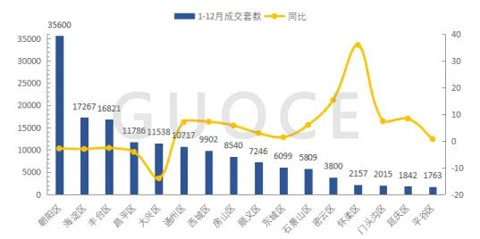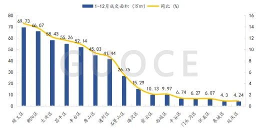 2024年1-12月,朝阳区、海淀区、丰台区等区域为北京商品住宅成交主力区域,共成交69688套,占城市成交套数的45.6%。其中,成交套数同比增长的区域有怀柔区、密云区、延庆区等,同比分别增长35.9%、15.3%、8.4%;成交套数同比下降的区域有大兴区、昌平区、海淀区等,同比分别下降14.0%、4.1%、3.0%。