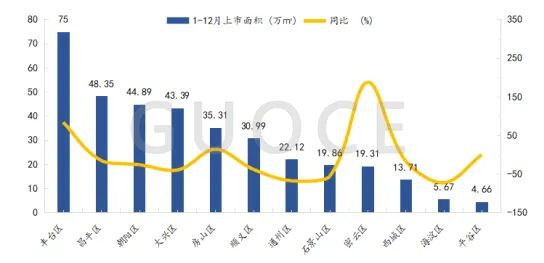 2024年1-12月北京商品住宅(不含保障性住房)分区域新批上市面积情况(万㎡)