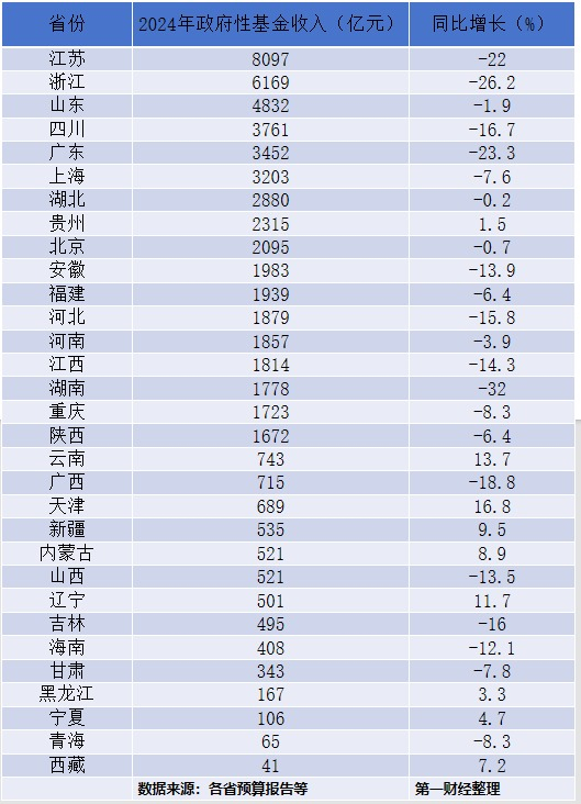 政府性基金收入是地方财力重要来源。近日,第一财经根据31省份预算报告整理发现,2024年江苏政府性基金收入以约8097亿元稳居榜首,浙江超6000亿元收入规模排在第二,山东则以超4000亿元位居第三。