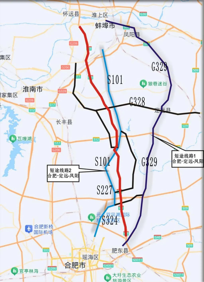 合肥至定远、定远至凤阳方向的短途车辆选择G329国道、S227、S101等地方道路绕行。