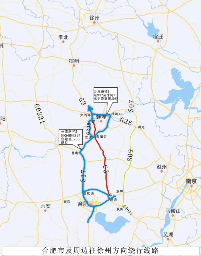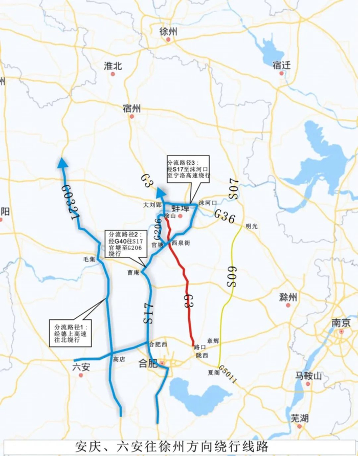届时,芜湖、南京往徐州方向可绕行S09明巢高速;铜陵、安庆、六安往徐州方向可绕行G0321德上高速;合肥市区及周边车辆往徐州方向可绕行S17蚌合高速;沿线中短途车辆可绕行G329或G206国道。