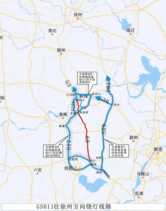 合肥市及周边往蚌埠、徐州方向选择S17蚌合高速绕行,也可由凤阳连接线绕行。