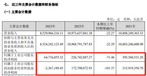 共进股份公告称,公司收入结构中网通业务占比超过70%。2024年,通信终端设备市场行情仍然低迷,市场竞争加剧,产业链各环节价格连续下跌,行业整体毛利及盈利水平有所下降。同时,房地产行业深度调整,导致共进股份的部分房屋建筑物产生减值损失。共进股份公告称,基于谨慎性原则,结合市场情况判断和会计准则要求,公司2024年拟对固定资产、在建工程、存货、应收账款/应收票据等计提减值损失。近年来,共进股份的业绩持续大幅下降。2021年、2022年、2023年,公司归母净利润分别为3.96亿元、2.27亿元、6471.61万元,扣非后净利润分别为3.16亿元、1.73亿元、-236.72万元。