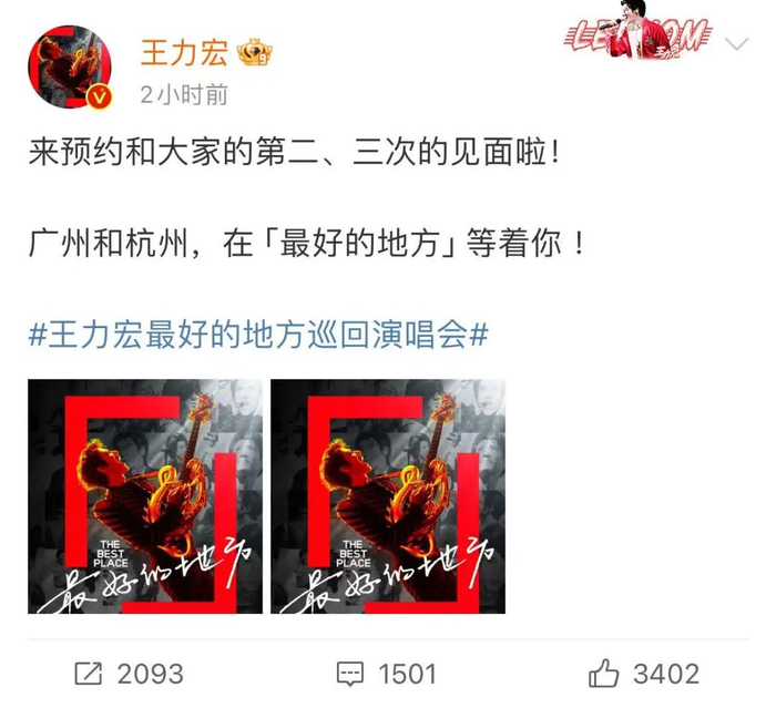 2月24日下午,王力宏正式官宣“最好的地方”巡回演唱会新增广州、杭州两站的日程。