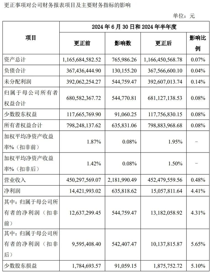 公司按照 2024 年半年度审计报告口径对已披露的 2024 年半年度报告相关内容进行更正。
