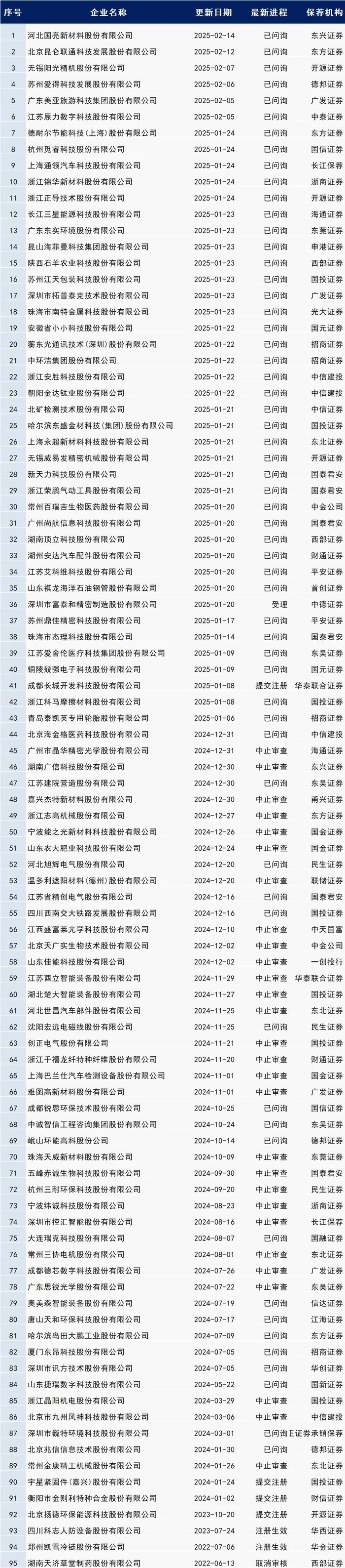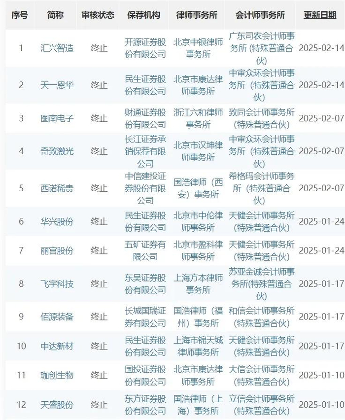 2月14日,天一恩华、汇兴智造2家公司宣布撤回北交所上市申请,至此2025年以来共有12家公司从北交所IPO“撤单”,其中飞宇科技2023年7月31日提交注册,近1年半后,2025年1月13日选择终止注册!图南电子2023年11月30日上会通过,过会1年多后也主动撤回,2025年1月16日被终止注册程序。