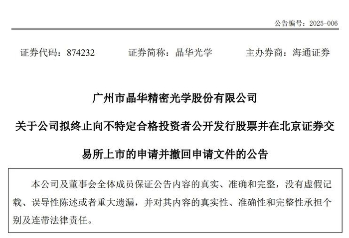 2月14日,晶华光学公告称,基于公司战略发展考虑及资本市场外部环境等因素,经公司认真研究和审慎论证后,决定调整资本市场战略规划,拟终止此次北交所上市的申请。