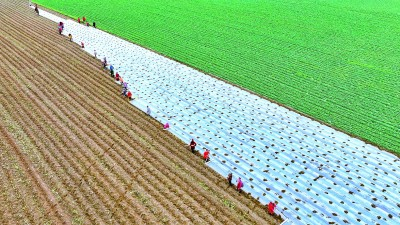 四川遂宁部营村村民在田垄间播撒玉米种子、铺设地膜。新华社发