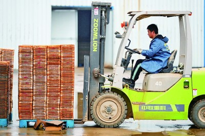 在湖南浏阳一家合作联合社,工作人员使用叉车搬运秧盘。新华社发