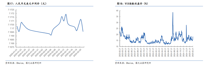 3. 人民币小幅升值,中美利差收缩,外资流出压力减小。人民币兑美元中间价较上周小幅度下降至7.1696。VIX恐慌指数较上周上升。美联储维持利率不变的预期略有回落。本周对最近一次(2025年3月19日)美联储会议维持利率不变的概率为95.5%,而降息25bp的概率为4.5%。10Y中美利差收缩至2.69%。