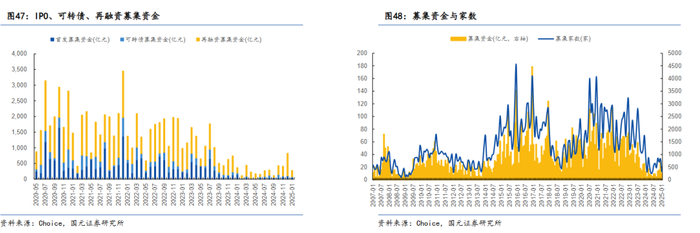 • 自2023年8月27日证监会提出“阶段性收紧IPO节奏”,IPO等募资规模持续下降。2025年1月,再融资规