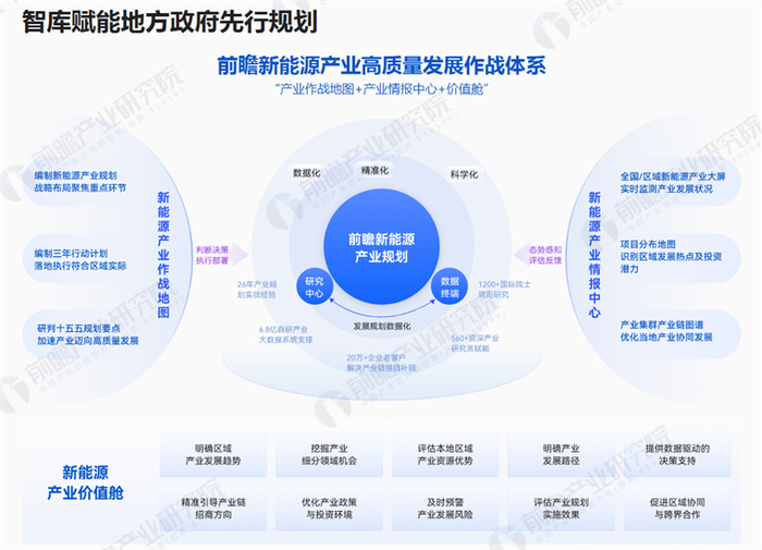 前瞻新能源产业高质量发展作战体系包括“产业作战地图+产业情报中心+价值舱”三大板块。这一体系旨在通过科学的规划和持续优化,帮助区域实现新能源产业的快速突破。