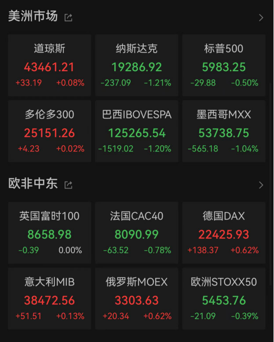 当地时间2月24日,美股三大指数冲高回落,尾盘跳水。截至收盘,道琼斯工业指数上涨0.08%,纳斯达克指数下跌1.21%,标普500指数下跌0.50%。
