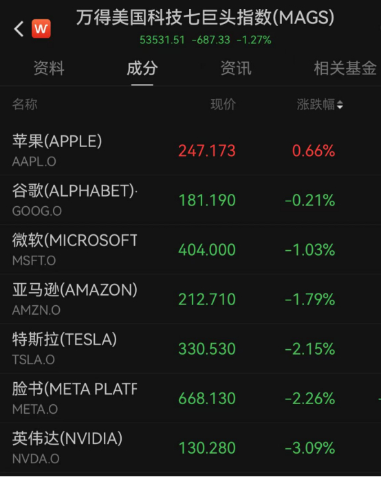 大型科技股多数下跌。Wind美国科技七巨头指数下跌1.27%,苹果上涨0.66%,谷歌-C下跌0.21%,微软跌1.03%,亚马逊跌1.79%,特斯拉跌2.15%,Meta跌2.26%。英伟达跌3.09%,单日市值蒸发1016亿美元(约合人民币7364亿元)。