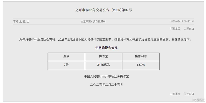 另外,为保持银行体系流动性充裕,央行同日以固定利率、数量招标方式开展了3185亿元逆回购操作。