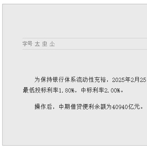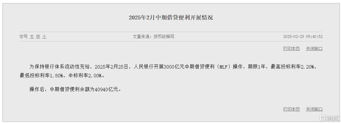 2月25日,中国人民银行公告,为保持银行体系流动性充裕,开展3000亿元中期借贷便利(MLF)操作,期限1年,最高投标利率2.20%,最低投标利率1.80%,中标利率2.00%。