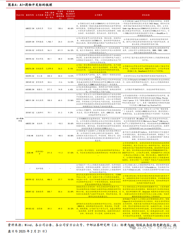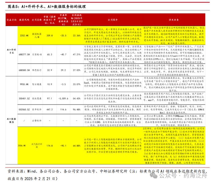 近期“AI+医疗”个股表现优异,其中AI+辅助诊断、AI+数据服务领域个股表现亮眼。自2025年2月5日起,“AI+医疗”个股涨幅较高的有“AI+辅助”领域安必平(+115.49%)、华大智造(+82.43%)、卫宁健康(+98.77%))、迪安诊断(+79.90%)、美年健康(+66.28%)、金域医学(+63.97%)等,以及“AI+数据服务”领域东华软件(+96.48%)、讯飞医疗科技(+64.88%)等。AI加速赋能“AI+医疗”,多家上市公司公布自身业务中AI的新应用场景。行业存在爆发式增长机会,我们认为“AI+医疗” 有望应用于药物研发、癌症诊断、医学影像、手术机器人等领域,行业或迎来巨变。“AI+医疗”高景气行情有望持续。