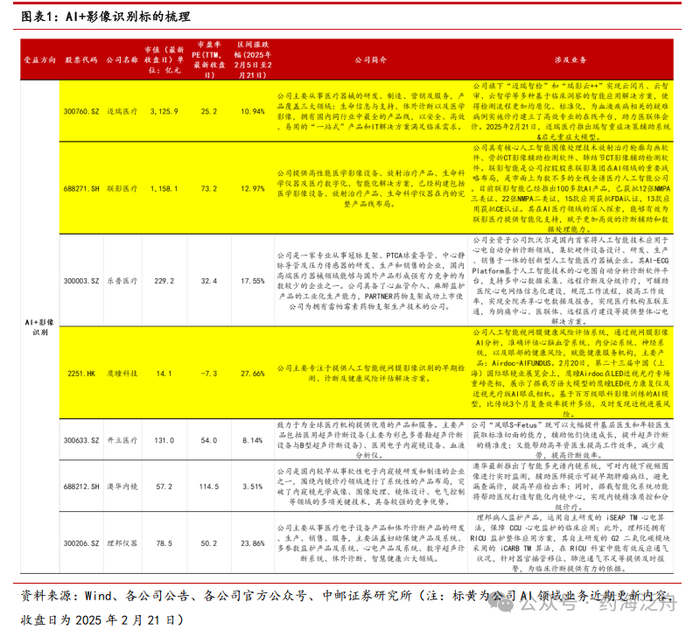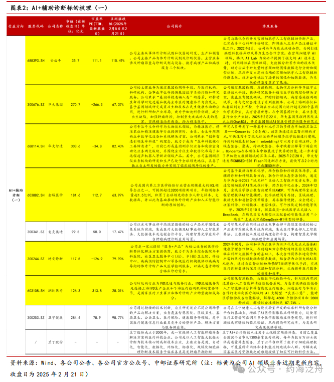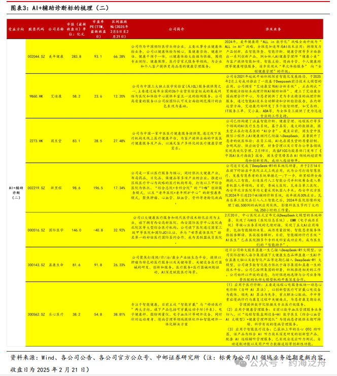 近期“AI+医疗”个股表现优异,其中AI+辅助诊断、AI+数据服务领域个股表现亮眼。自2025年2月5日起,“AI+医疗”个股涨幅较高的有“AI+辅助”领域安必平(+115.49%)、华大智造(+82.43%)、卫宁健康(+98.77%))、迪安诊断(+79.90%)、美年健康(+66.28%)、金域医学(+63.97%)等,以及“AI+数据服务”领域东华软件(+96.48%)、讯飞医疗科技(+64.88%)等。