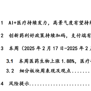 第三是AI+医药,有望成为医药2025年投资主线之一,AI应用领域广泛,涵盖药物研发、医学影像辅助诊断、慢病管理和健康监测、以及大数据平台和算力服务等多个环节,技术突破和商业化落地将带来巨大投资机会。建议关注布局AI药物研发的药明康德、AI+健康管理龙头平安好医生,AI影像应用成熟,效率持续提升的美年健康,AI赋能诊疗的盈康生命、讯飞医疗科技。