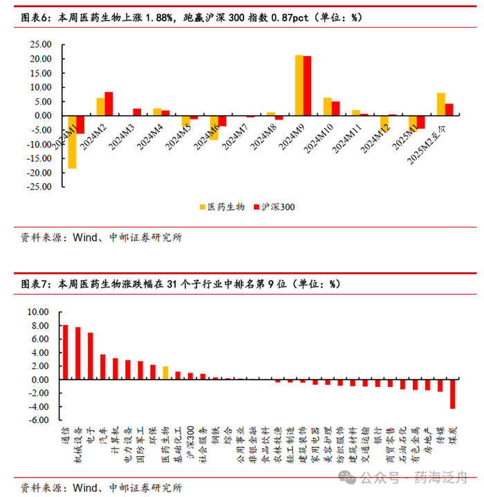本周医药生物上涨1.88%,跑赢沪深300指数0.87pct,在31个子行业中排名第9位。
