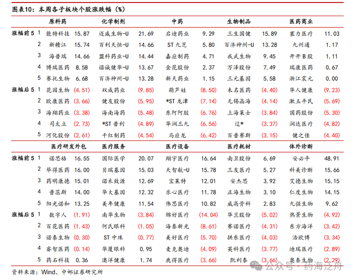 本周医疗研发外包板块涨幅最大,上涨11.3%;医院板块上涨5.59%,化学制剂板块上涨2.71%,体外诊断板块上涨2.7%,其他生物制品板块上涨1.75%;线下药店板块跌幅最大,下跌3.06%,血液制品板块下跌3.04%,中药板块下跌2.97%,医药流通板块下跌1.96%,医疗耗材板块下跌0.07%。