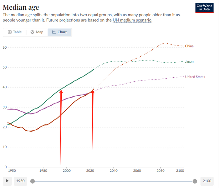 图片来自日经,那么我们看看日本,是1995年达到巅峰值,那一年日本的年龄中位数是38.9岁——
