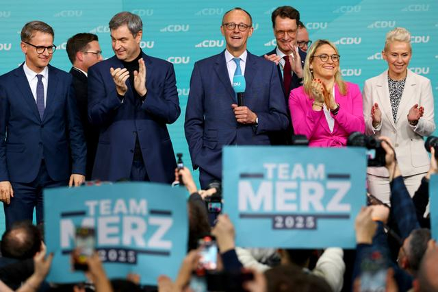 2月23日,德国首都柏林的基督教民主联盟总部,联盟党总理候选人弗里德里希·默茨(前中)在出口民调结果公布后接受祝贺。