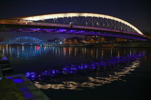2月24日,波兰克拉科夫,贝尔纳特卡人行天桥点亮灯光,以纪念俄乌冲突三周年。