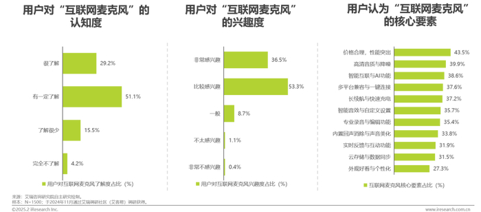 “互联网麦克风”的概念已在用户群体中有较强的认知度和兴趣度;性价比、高清音质与降噪功能、智能互联与AI功能是当下用户认为互联网麦克风必备的核心要素。