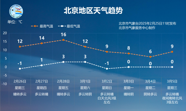 预计2月26日至3月5日,白天最高气温6~16℃,夜间最低气温 -1~3℃。
