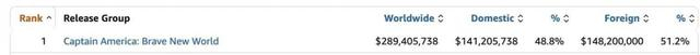 更明显的对比发生在票仓结构上。上述网站数据显示,截至北京时间2月24日,《美国队长4》本土票房占比为51.2%,海外票房的占比为48.8%。而根据灯塔专业版数据,《哪吒2》本土票房占比在99%以上。