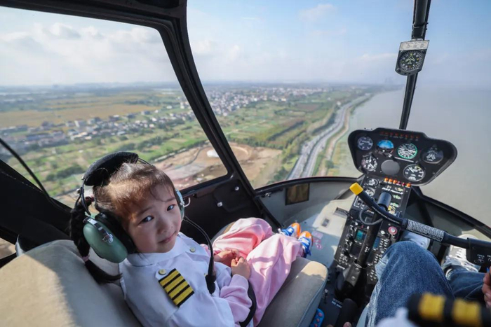 ▲近年来,浙江省湖州市吴兴高新区充分发挥毗邻太湖的地理优势,推进低空经济发展。图为小游客乘坐米旗通航直升机飞行基地的直升机在空中饱览太湖南岸美景。新华社记者 徐 昱 摄